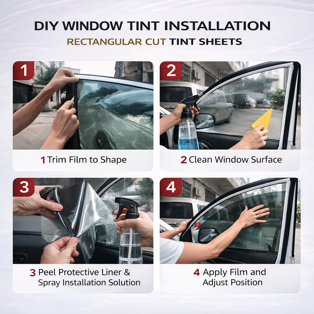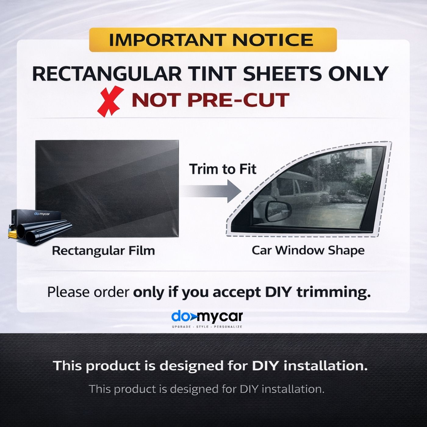 Unlike traditional pre-cut window tint kits, Do-MyCar DIY Cutting Kits are supplied in larger rectangular sheets, specifically designed for each car model. This allows car owners to experience professional-style installation, where the film can be trimmed and finished directly on the vehicle window for a perfect edge.