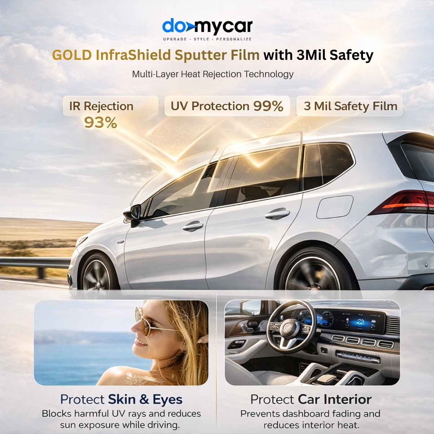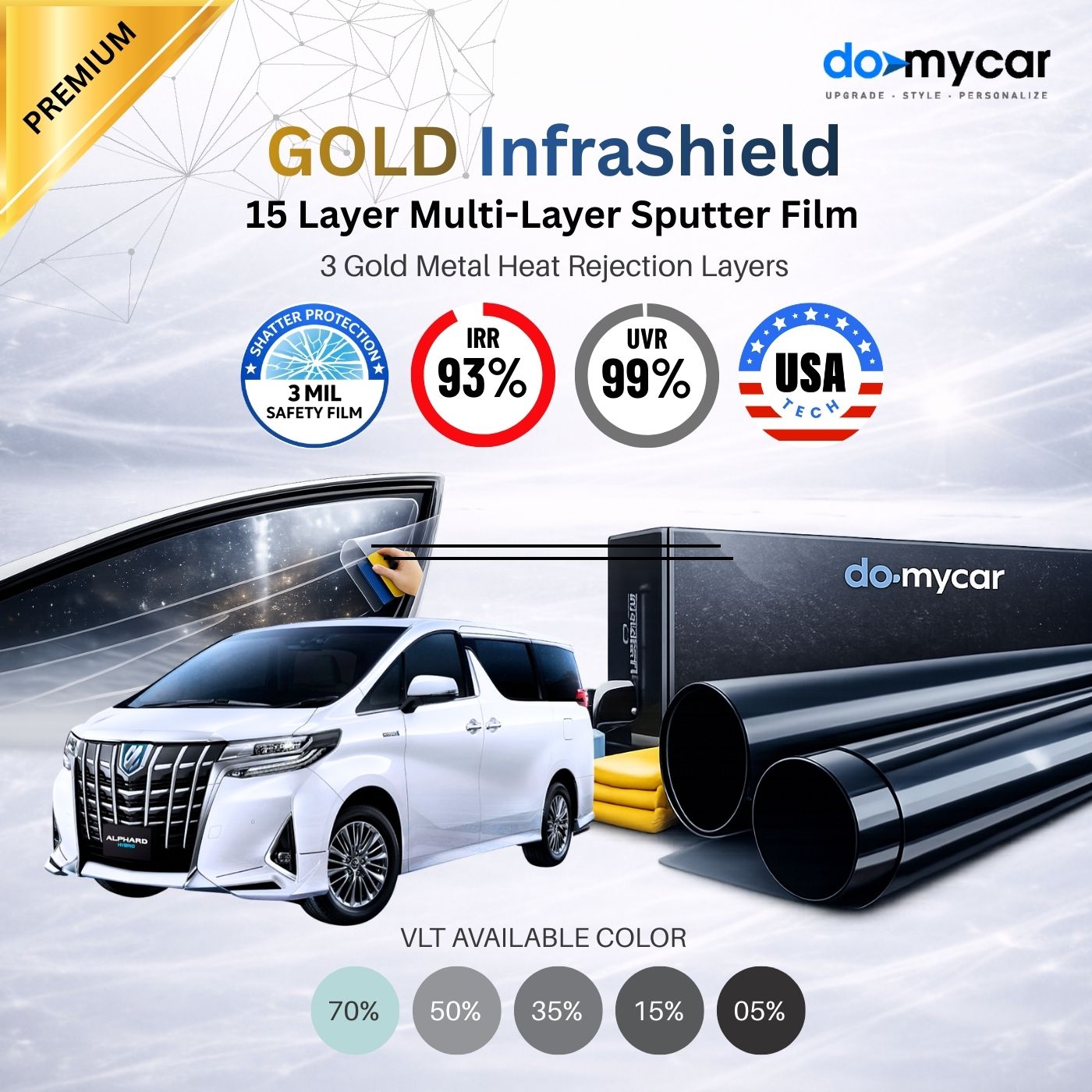 Gold InfraShield Multi-Layer Sputtering with Safety 3mil Window Tint – Full Car DIY Cutting Kit