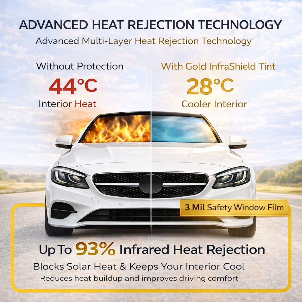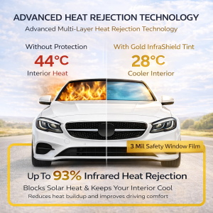 Upgrade your vehicle with Gold InfraShield Premium Window Tint, designed with advanced multi-layer sputtering technology and triple gold metal heat rejection layers. This high-performance window film provides superior heat reduction, UV protection, and enhanced safety, delivering a cooler and more comfortable driving experience.