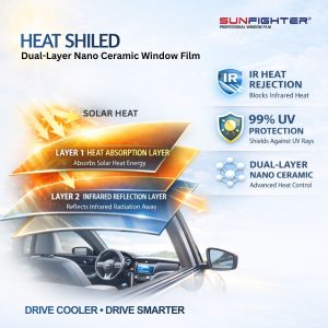 Upgrade your vehicle with Sun-Fighter Heat Shield Nano Ceramic Window Tint, engineered with dual-layer nano ceramic technology designed to improve heat rejection, UV protection, and overall driving comfort. This advanced window film combines heat absorption and infrared reflection to help keep your vehicle interior cooler while maintaining clear visibility.
